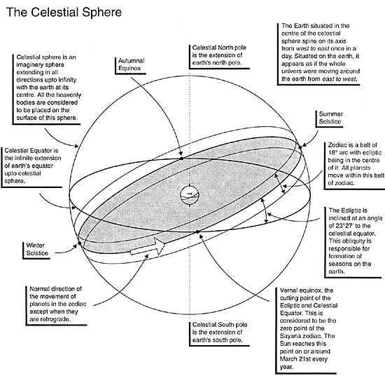 To establish a relationship of the earth with the zodiac, we have to refer to some identifiable point on the zodiac. The rising, setting or the meridian passage of this point is to be observed to find out the actual position of this point at any given moment of time for the place of location of the observer. Once we know the position of one point of the zodiac, we can relate the other points of the zodiac with respect to this identifiable point.